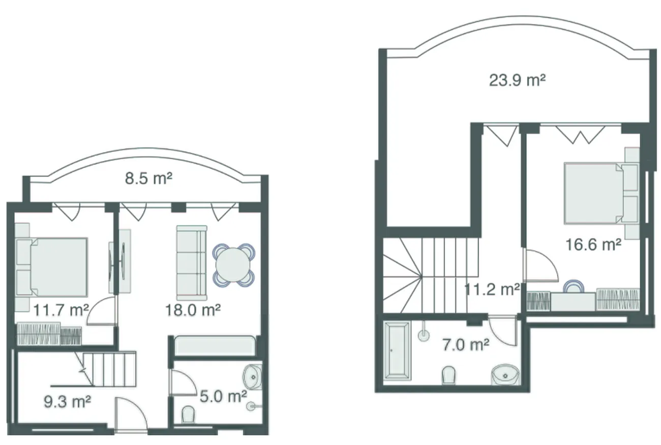 V prvním patře se nachází světlý obývací pokoj s kuchyní (18 m²), samostatná ložnice (11,7 m²), koupelna a vstup na terasu (8,5 m²). První patro je věnováno soukromé části: prostorné ložnici (16,6 m²) s vlastní koupelnou a přístupem na velkou terasu (23,9 m²), která může být vaším venkovním obývacím pokojem s výhledem do atria. Hlavní výhody: rozdělení na dvě úrovně, izolované ložnice pro soukromí, panoramatická okna a dvě terasy pro venkovní relaxaci.