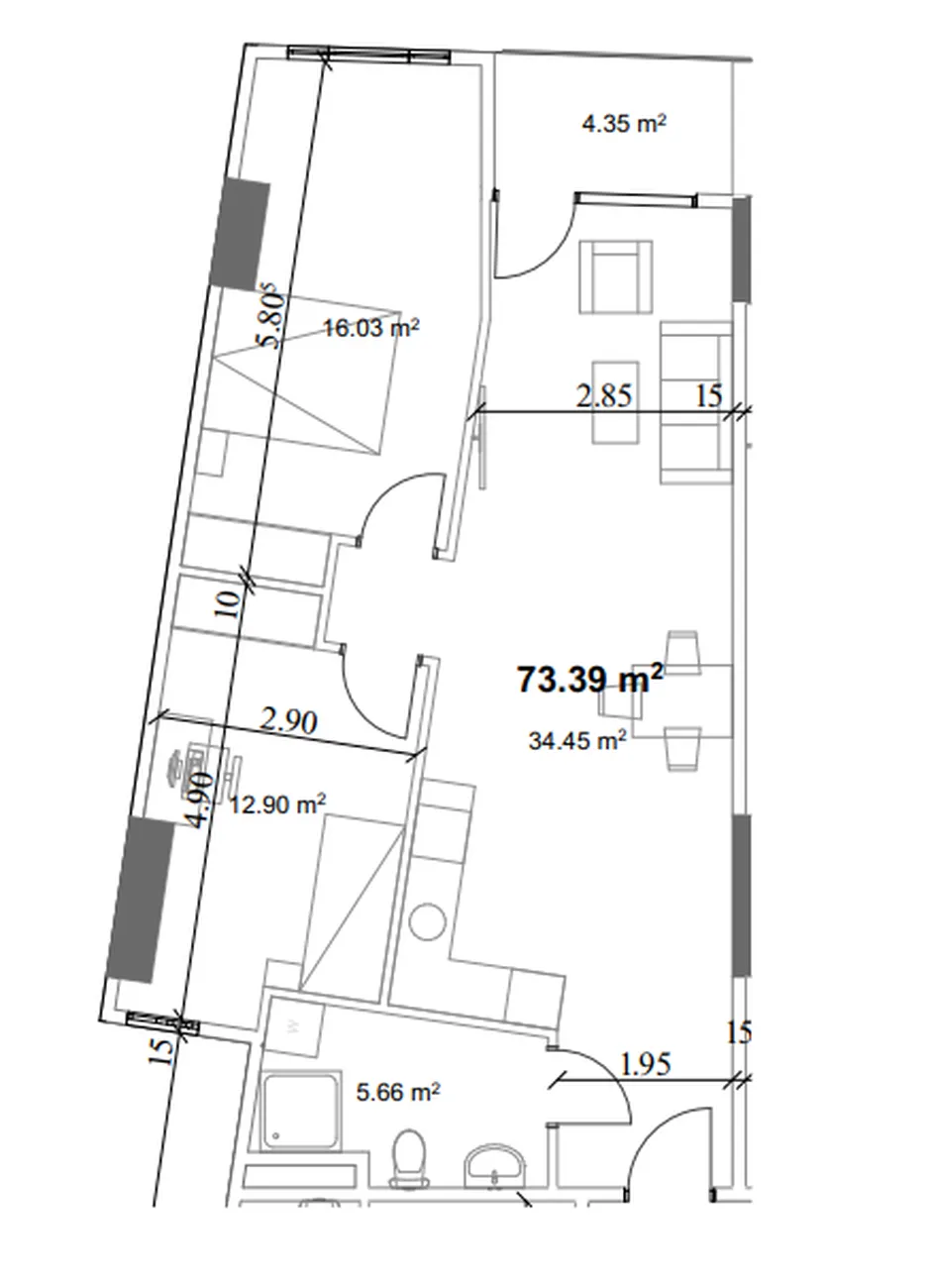 Byt nabízí pohodlné uspořádání: prostorný obývací pokoj (34,45 m²) s kuchyňským koutem a dva samostatné pokoje (12,90 m² a 16,03 m²), ideální pro ložnici a dětský pokoj nebo pracovnu. Koupelna je samostatná (5,66 m²) a balkon dodává útulný prostor pro relaxaci. Izolace pokojů zajišťuje soukromí, zatímco panoramatická okna zaplavují byt světlem a nabízejí příjemný výhled.