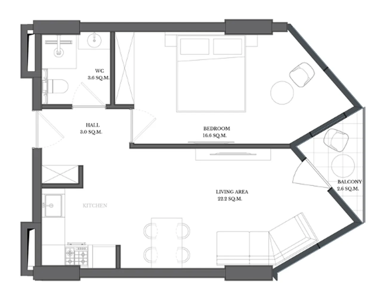Praktické uspořádání zahrnuje samostatnou ložnici (16,6 m²) a prostorný obývací pokoj s jídelnou. 22.2 м²oddělené malou halou. Koupelna je kombinovaná. Toto uspořádání nabízí více soukromí než klasické studio a... balkon doplňuje příjemný otevřený prostor. ✅ Výhody: oddělená ložnice pro soukromí, efektivní zónování, dobré přirozené světlo.