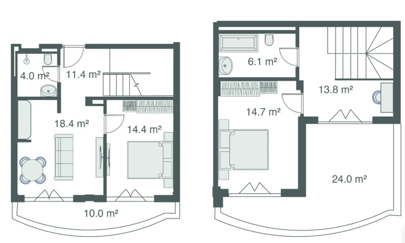 V přízemí se nachází prostorný obývací pokoj s kuchyní (18,4 m²), samostatná ložnice (14,4 m²), koupelna a vstup na terasu (10 m²). Druhé podlaží je soukromá zóna s velkou ložnicí (14,7 m²), koupelnou a přístupem na obrovskou terasu (44 m²), kterou lze zřídit jako venkovní posezení, relaxační zónu nebo minizahrádku. Hlavní výhody: dvoupodlažní dispozice s jasným rozdělením do zón, izolované ložnice pro soukromí, panoramatická okna s výhledem do atria a rekordní terasa - váš vlastní soukromý venkovní prostor.
