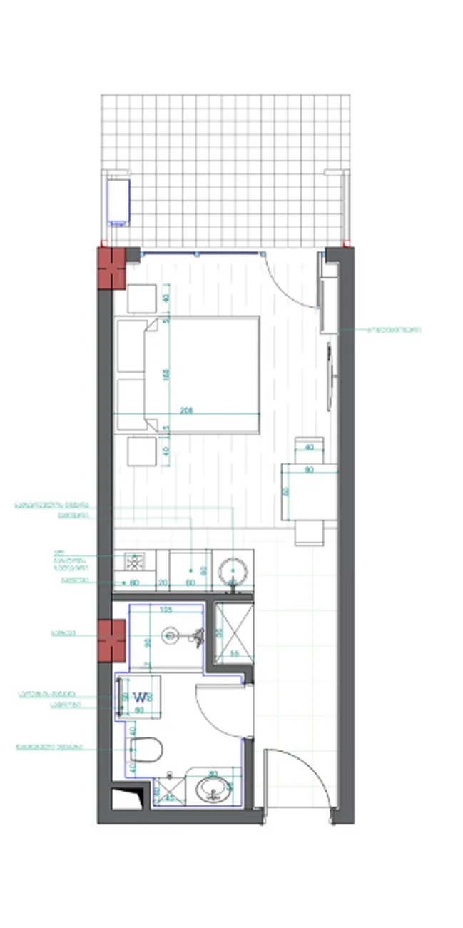 Moderní otevřený prostor kombinuje obývací pokoj, prostor na spaní a kuchyňský kout. Na ranní kávu nebo večerní relaxaci je připraven obložený balkon. Koupelna je navržena s ohledem na moderní ergonomii. Všechny základní komunikace jsou již připojeny: elektrické body (18 ks), přívod vody, kanalizace a topení - zbývá jen doplnit finální úpravy podle vašeho vkusu.