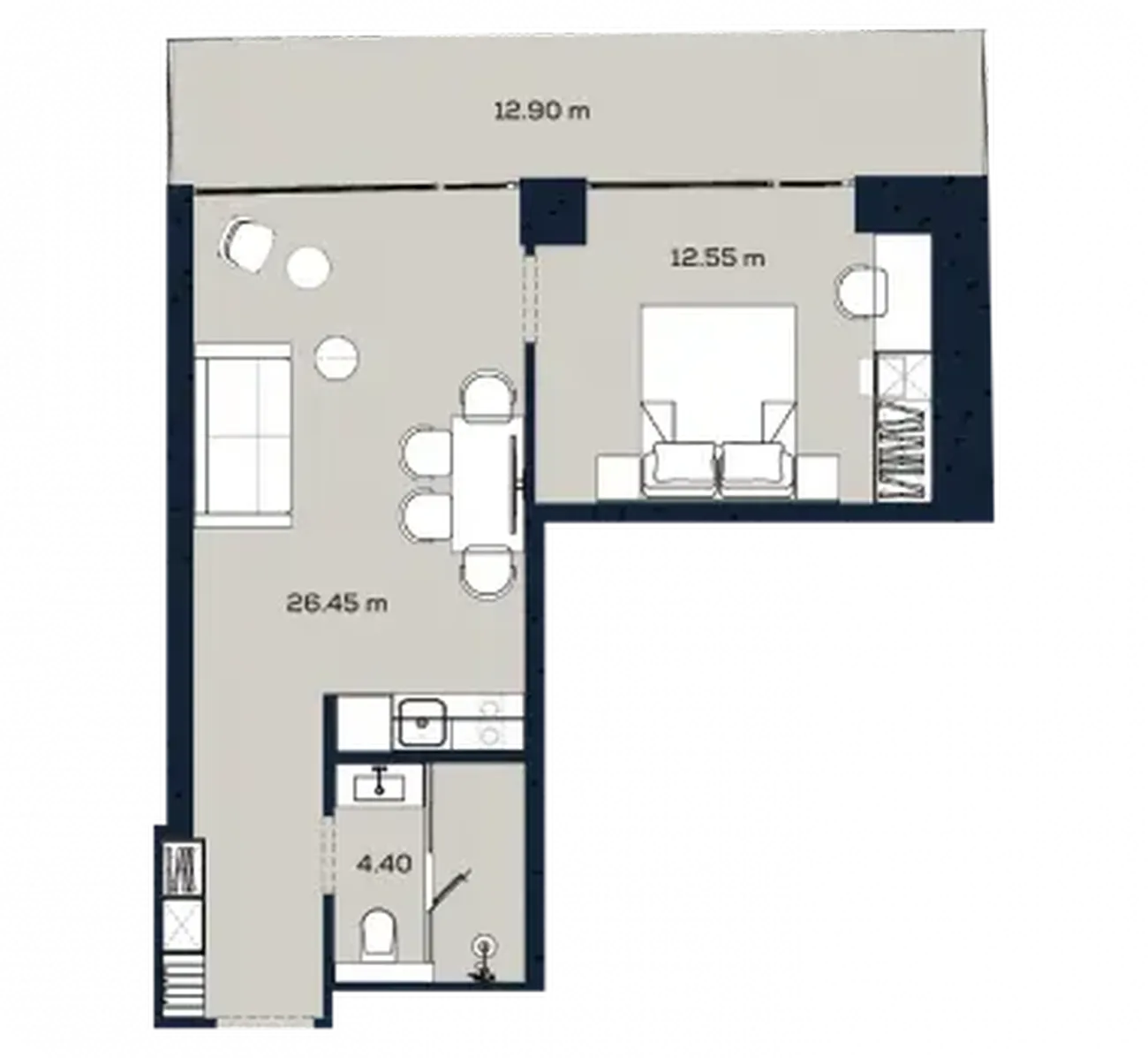 Prostor zahrnuje útulnou ložnici (12,55 m²) a prostornou otevřenou obývací kuchyň (26,45 m²). Velká terasa se stává plnohodnotným rozšířením obývacího pokoje - váš soukromý letní obývací pokoj s výhledem. Byt doplňuje moderní kombinovaná koupelna. Výhody: ergonomický open-space prostor, obrovský potenciál terasy pro relaxaci, panoramatické prosklení, které naplňuje interiér světlem.