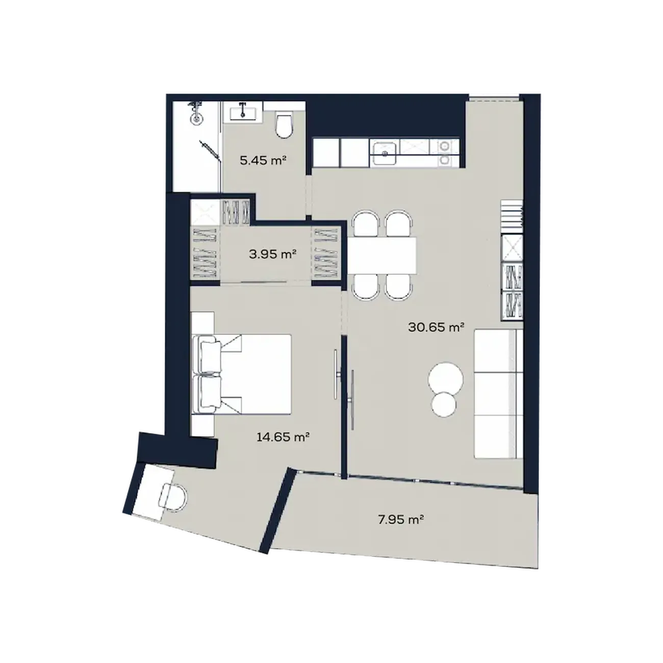 V bytě se nachází prostorná obývací kuchyně (30,65 m²), útulná ložnice (14,65 m²) a samostatná šatna (3,95 m²). Obraz doplňuje balkon a moderní koupelna. Hlavní přednosti: volný otevřený obytný prostor, praktická šatna jako komfortní prvek, velká okna a ergonomické využití prostoru.