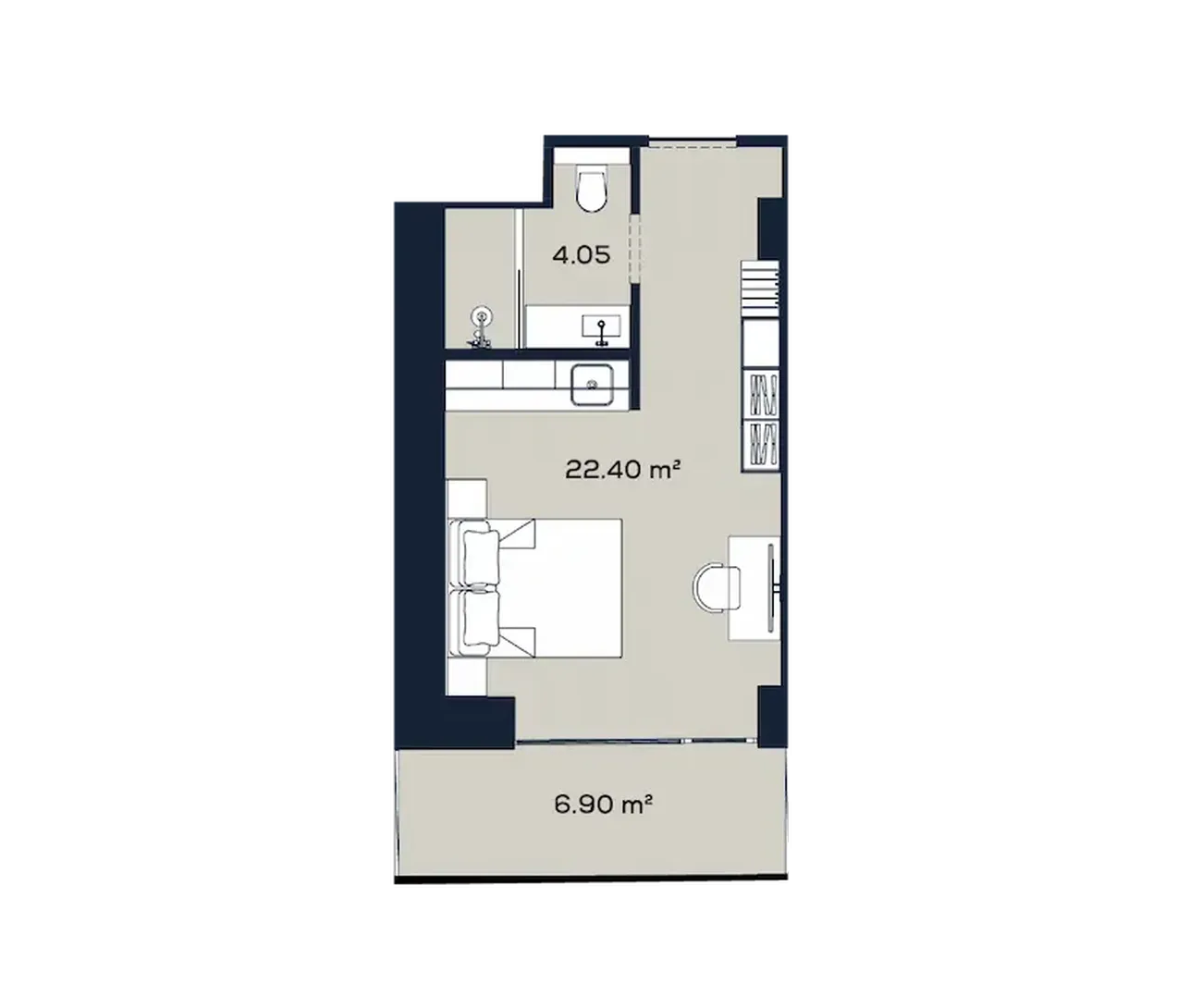 Obývací, spací a kuchyňskou část spojuje jeden světlý prostor (22,40 m²). Balkon opticky rozšiřuje místnost a stává se útulným zákoutím. Výhody: maximální využití prostoru, panoramatické prosklení pro vynikající osvětlení, moderní koupelna a pocit prostornosti navzdory kompaktnímu formátu.