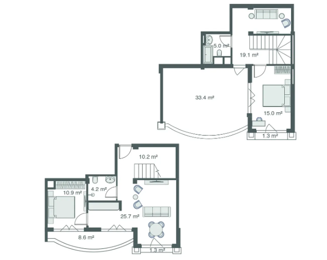 V přízemí se nachází světlý obývací pokoj s kuchyní (25,7 m²), samostatná ložnice (10,9 m²), koupelna a dvě kompaktní terasy (1,3 m² a 8,6 m²). První patro je věnováno soukromé části: prostorné ložnici (15 m²) s vlastní koupelnou a přístupem na dvě terasy, včetně obrovské (33,4 m²). Výhody: dokonalé oddělení hostovské a soukromé části, panoramatická okna s výhledem do útulného atria a nebývale velká terasa v prvním patře - skutečný venkovní obývací pokoj pod širým nebem.