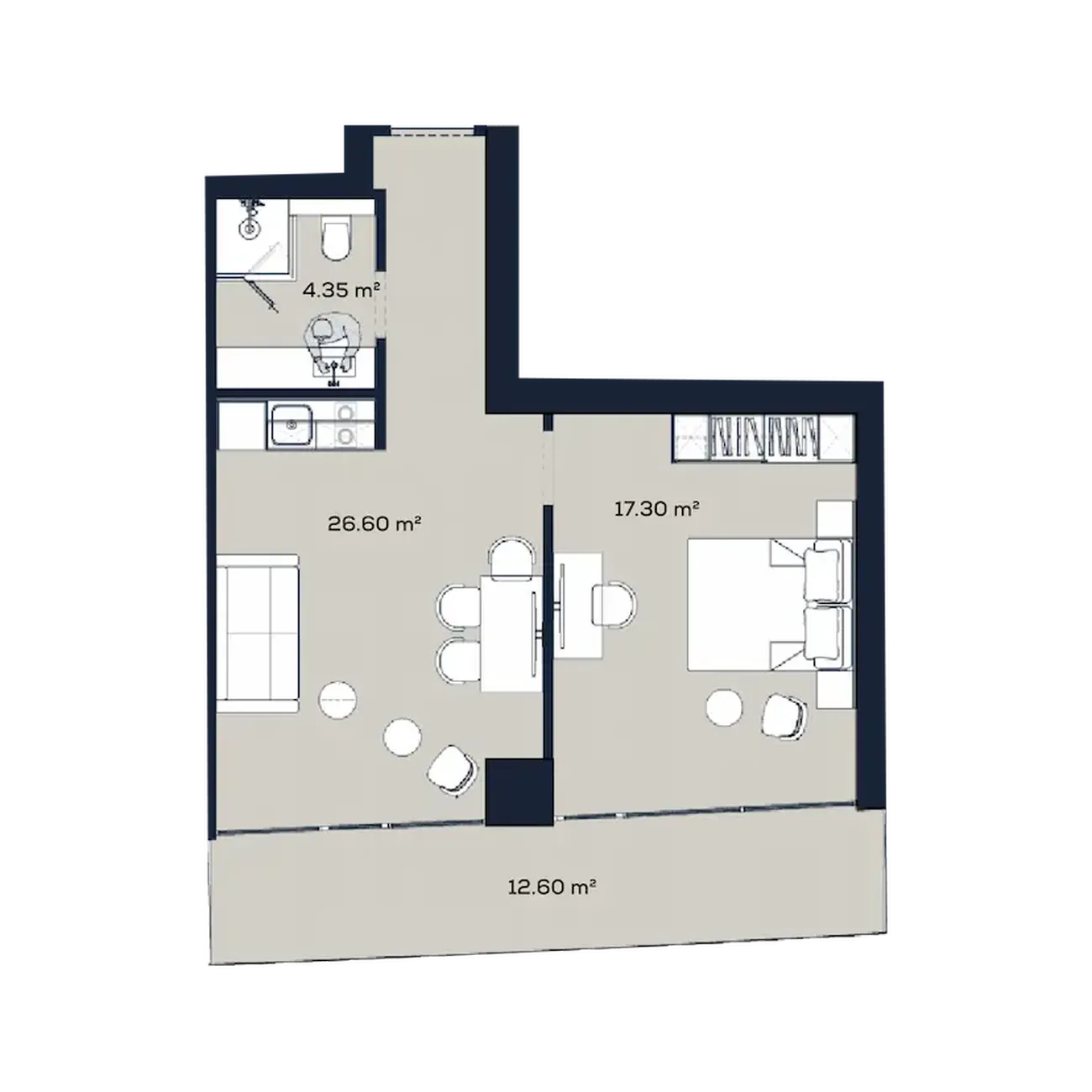 Prostorný byt s 1 ložnicí v moderním půdním formátu. Celková plocha je 60,85 m² včetně velké terasy o rozloze 12,60 m². Prestižní adresa v rezidenčním komplexu Alliance Centropolis na hlavní tepně Batumi, Rustaveli Avenue.