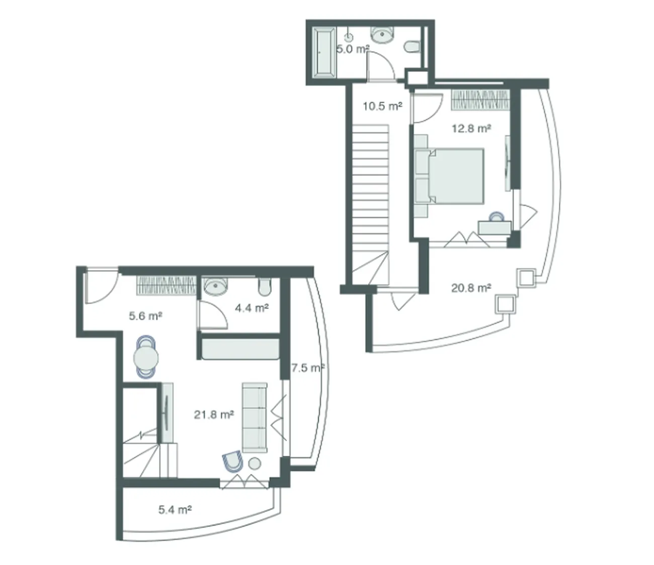 Im Erdgeschoss befindet sich ein helles 21,8 m² großes Wohnzimmer mit Küche und Bad. Von hier aus haben Sie Zugang zu einer großen Terrasse (20,8 m²), ideal zum Entspannen und für Empfänge. Die erste Etage ist ganz dem privaten Bereich gewidmet: ein gemütliches Schlafzimmer (12,8 m²) mit eigenem Bad und Zugang zu zwei Terrassen (5,4 m² und 7,5 m²). Die wichtigsten Vorteile: Panoramaverglasung mit Blick auf die Berge, mehrere Außenbereiche auf verschiedenen Ebenen und die für das Penthouse-Format charakteristische absolute Privatsphäre.