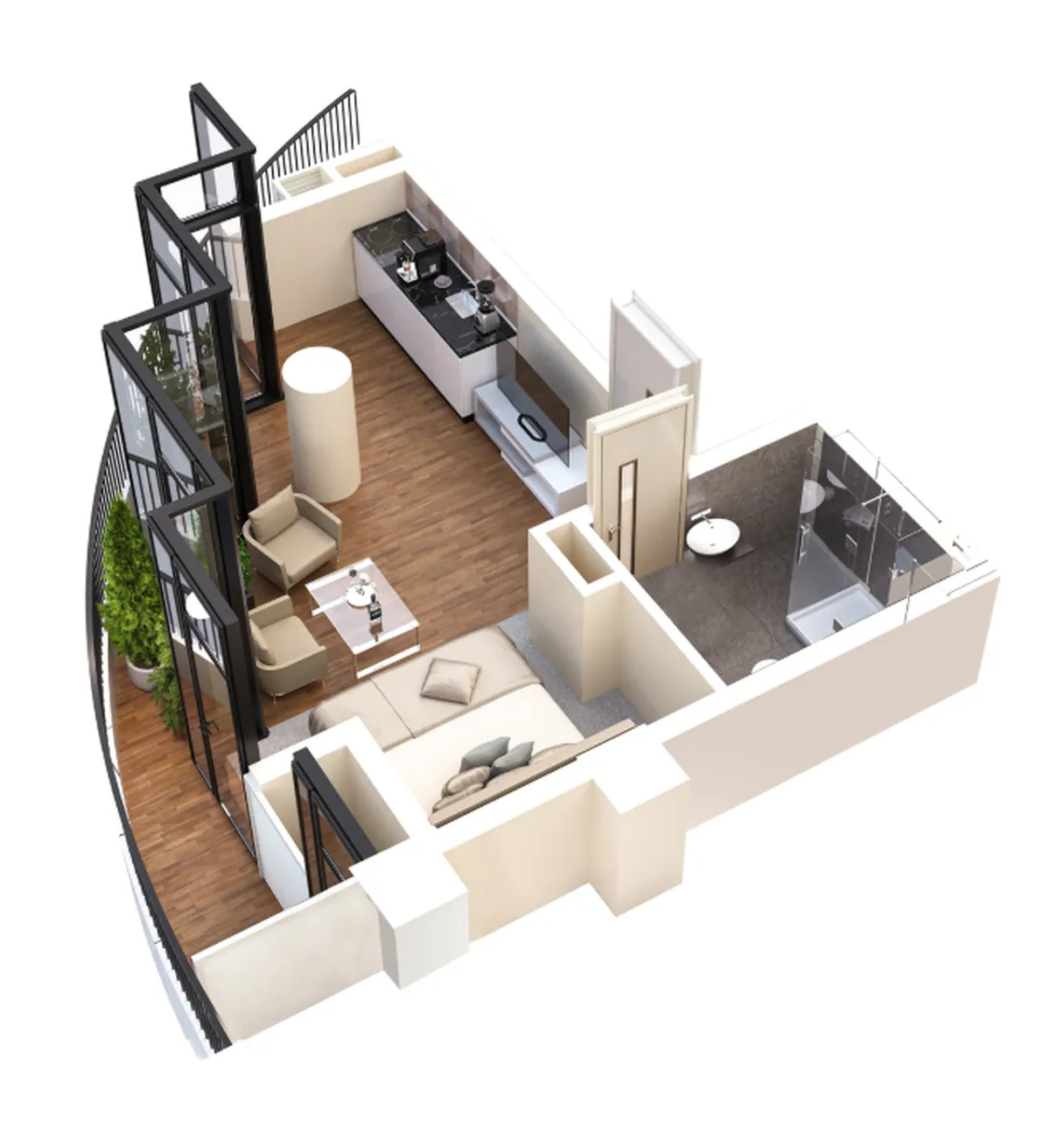 Die Studios sind ergonomisch organisiert: Ein einziger Raum kombiniert einen Schlafbereich, eine Kochnische und einen Platz zum Entspannen. Großes Fenster mit Zugang zu Balkon füllt den Raum mit Licht und bietet einen Blick auf das Meer oder die grüne Umgebung von Kobuleti. Badezimmer kompakt und funktional. Die Deckenhöhe beträgt 2,9 Meter, was den Raum noch luftiger macht. Der "weiße Rahmen" gibt Ihnen die Freiheit, Ihre Oberflächenmaterialien zu wählen, und die monolithische Rahmentechnologie gewährleistet Zuverlässigkeit und Langlebigkeit.