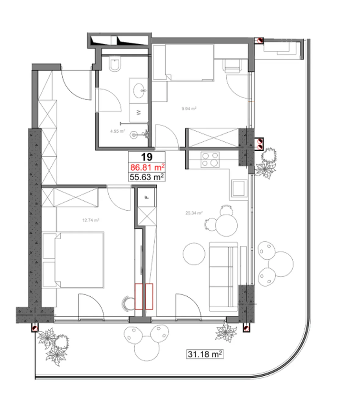 Ideale Aufteilung für komfortables Wohnen: zwei isolierte Schlafzimmer (12,74 m² und 9,94 m²), ein geräumiges Wohnzimmer mit Küche (25,34 m²) und ein separates Badezimmer. Der größte Vorteil ist großzügige Terrasse von 31,18 m²Die großen Fenster füllen die Wohnung mit Licht und der Boden bietet einen Panoramablick und Ruhe. Große Fenster füllen die Wohnung mit Licht, und der Boden bietet einen Panoramablick und Ruhe.