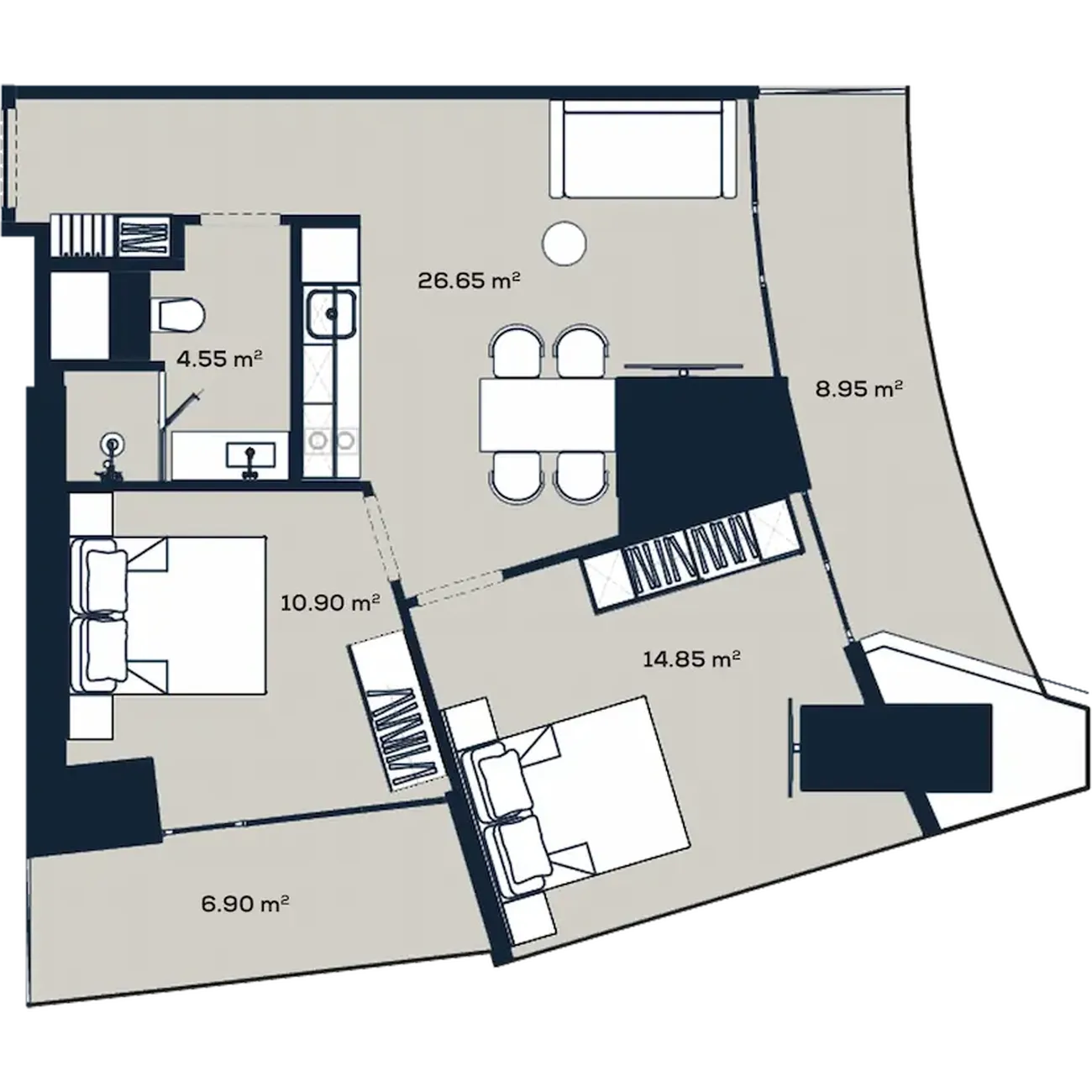The flat includes two isolated bedrooms (10.9 m² and 14.85 m²)spacious living room (26.65 m²) и separate bathroom (4.55 m²). The feature is. two balconies (6.9 m² and 8.95 m²)The large windows fill the space with light and the clear zoning ensures a harmonious combination of privacy and socialisation. The large windows flood the space with light, and the clear zoning ensures a harmonious combination of privacy and socialisation.