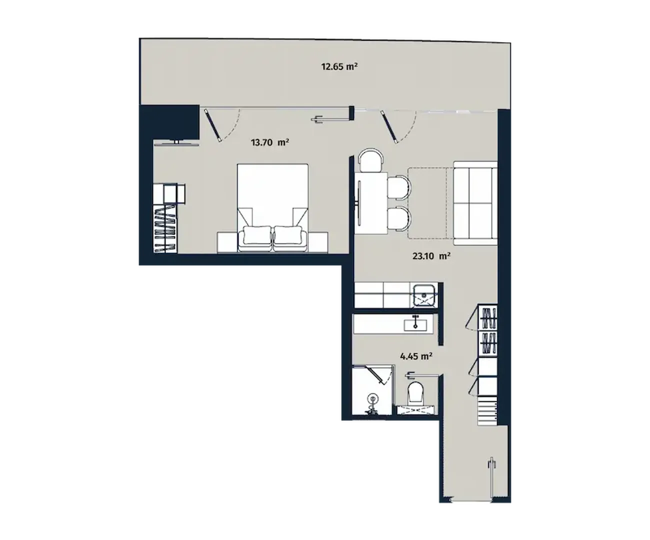 The flat includes isolated bedroom (13.7 m²)spacious living room (23.1 m²) и separate bathroom (4.45 m²). The main feature is. large balcony (12.65 m²)The panoramic windows fill the interior with light and the clear zoning creates a balance between privacy and open space. Panoramic windows flood the interior with light, while clear zoning creates a balance between privacy and open space.