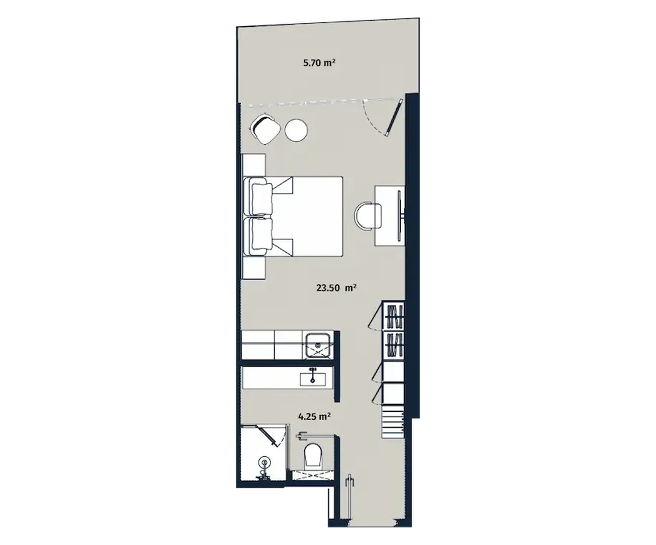 Open space residential area (22.50 m²) with clever zoning combines living and sleeping space, creating a modern loft atmosphere. Complementing the flat separate bathroom (4.25 m²) и comfortable balcony (5.70 m²) for relaxation with a view of the city. Large windows fill the interior with light, and the concise layout allows you to make the most of every metre.