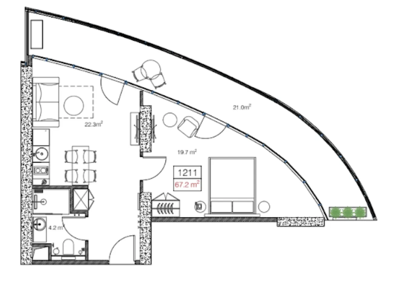 The flat has a balanced layout: a cosy isolated bedroom (19.7 m²), spacious living room (22.3 m²), separate bathroom (4.2 m²) and large outdoor terrace (21.0 m²)which becomes a full-fledged extension of the living space - the perfect place to relax, dine al fresco or contemplate the seascape. Large windows fill the interior with light, creating a feeling of space and freedom.