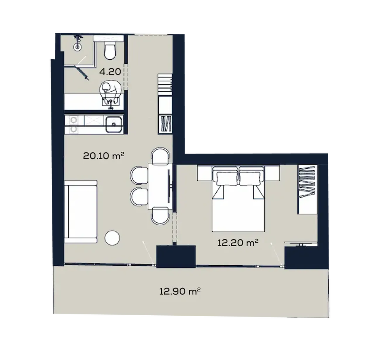 The flat includes isolated bedroom (12.2 m²), spacious living room (20.1 m²) и separate bathroom (4.2 m²). The main feature is. large balcony (12.9 m²)which easily becomes an additional seating area, dining room or open-air study. Panoramic windows flood the interior with light and create a sense of connection with the urban environment, while the modern layout ensures functionality.