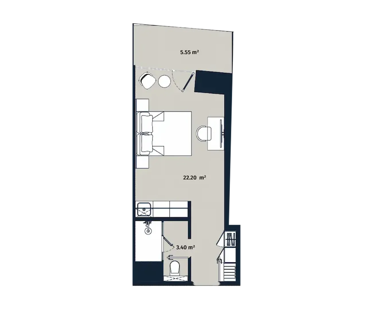 Open space residential area (22.20 m²) with clever zoning combines living and sleeping space, creating a modern loft atmosphere. Complementing the flat separate bathroom (3.40 m²) и comfortable balcony (5.55 m²) for relaxation with a view of the city. Large windows fill the interior with light, and the concise layout allows you to make the most of every metre.