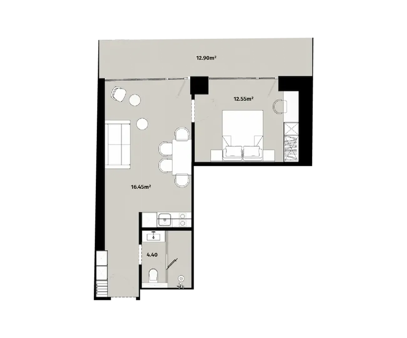 The flat includes isolated bedroom (12.55 m²), spacious living room (16.45 m²) и separate bathroom (4.40 m²). The feature is. spacious balcony (12.90 m²)The large windows fill the interior with light and the harmonious zoning creates a sense of freedom and privacy. Large windows flood the interior with light, while harmonious zoning creates a sense of freedom and privacy.