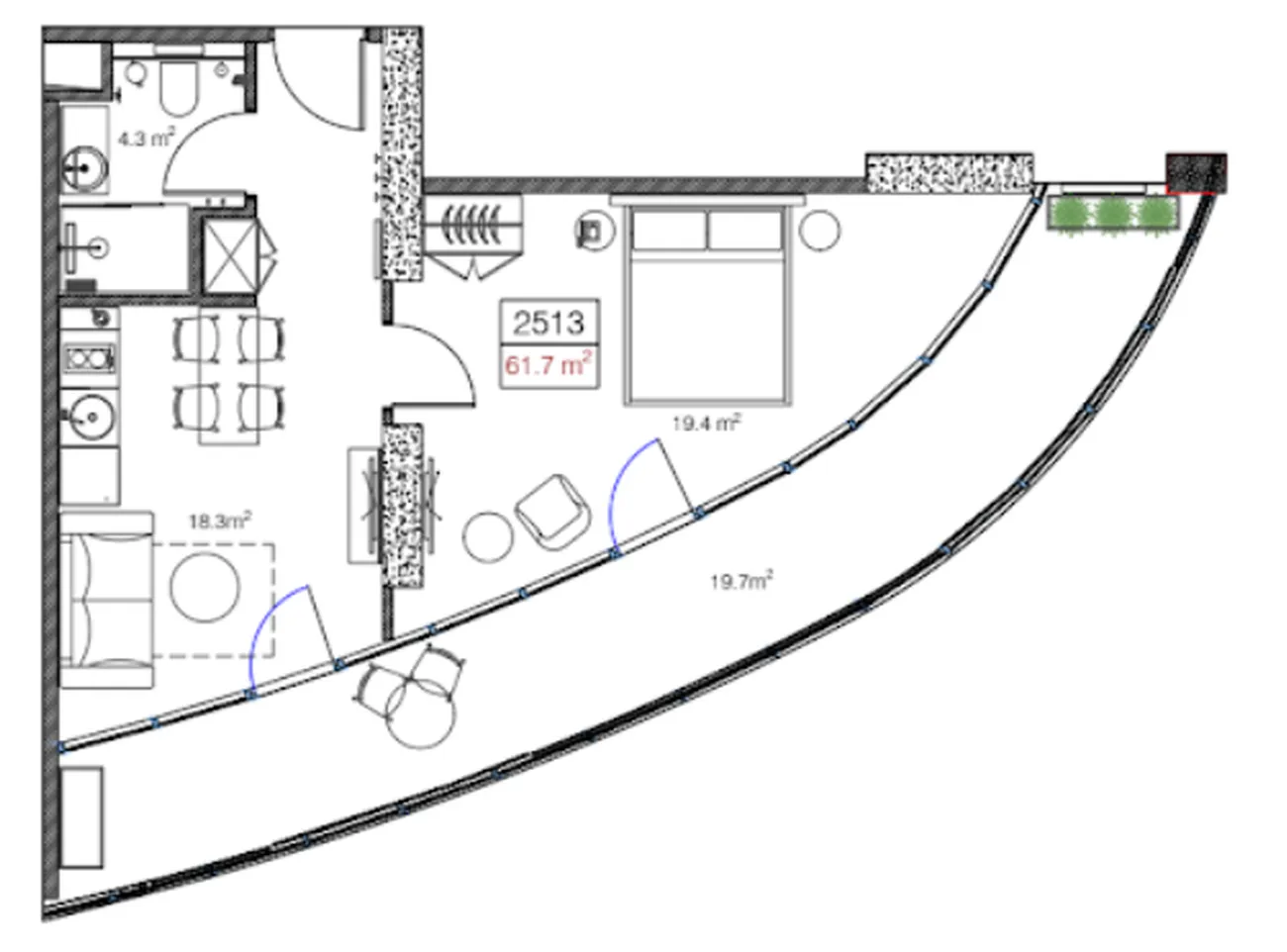 The flat is characterised by a harmonious layout: a spacious isolated bedroom (19.4 m²), light living room (18.3 m²), separate bathroom (4.3 m²) and large outdoor terrace (19.7 m²)The large windows fill the space with natural light, creating a feeling of spaciousness and freedom. Large windows fill the space with natural light, creating a feeling of space and freedom.