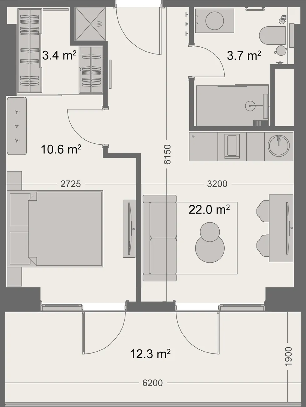 The flat has a practical layout: an isolated bedroom (10.6 m²), a spacious living room (22.0 m²), a separate bathroom and a convenient dressing room (3.4 m²) - a rarity for this format. A large balcony of 12.3 m² provides an additional seating area with picturesque mountain views. Panoramic glazing in the living room fills the space with light and emphasises the feeling of spaciousness.