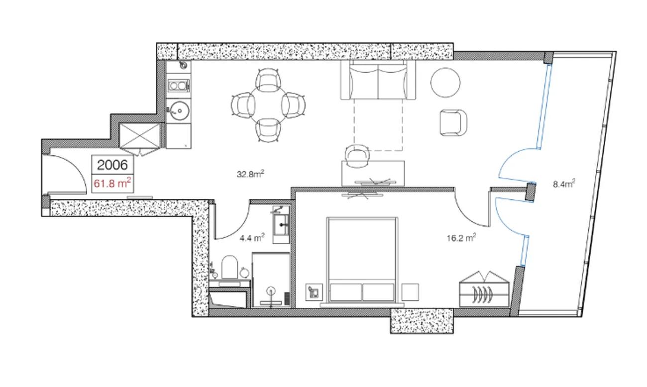 The flat offers an efficient layout: spacious living room (32.8 m²)cosy bedroom (16.2 m²)separate bathroom (4.4 m²) и comfortable balcony (8.4 m²)The large windows in the living room fill the space with light and create a feeling of openness. The large windows in the living room fill the space with light and create a feeling of openness, while the clever layout allows you to make the most of every metre.