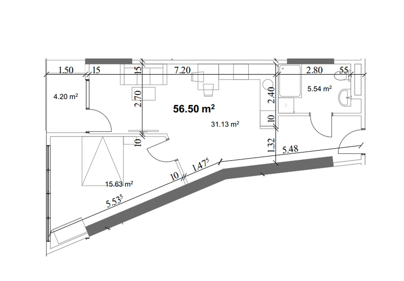 The flat offers balanced zoning: a bright living room (31.13 m²) with kitchen area and an isolated room (15.63 m²), ideal for a bedroom or study. The separate bathroom (5.54 m²) is comfortably sized and the balcony adds a corner for morning coffee. Panoramic windows flood the space with natural light, emphasising a sense of freedom and order.