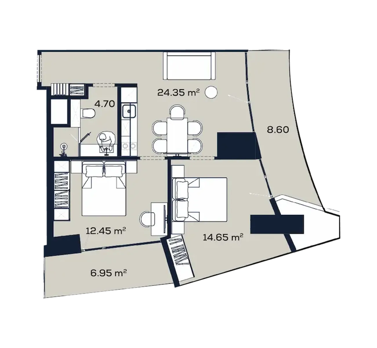 The layout offers two Insulated bedrooms (12.45 m² and 14.65 m²), spacious living room (24.35 m²) и separate bathroom (4.70 m²). The feature is. two balconies (6.95 m² and 8.60 m²)The large windows provide plenty of light and city views, while the clear zoning creates a harmony between privacy and common space. The large windows provide plenty of light and city views, while the clear zoning creates a harmony between privacy and common space.