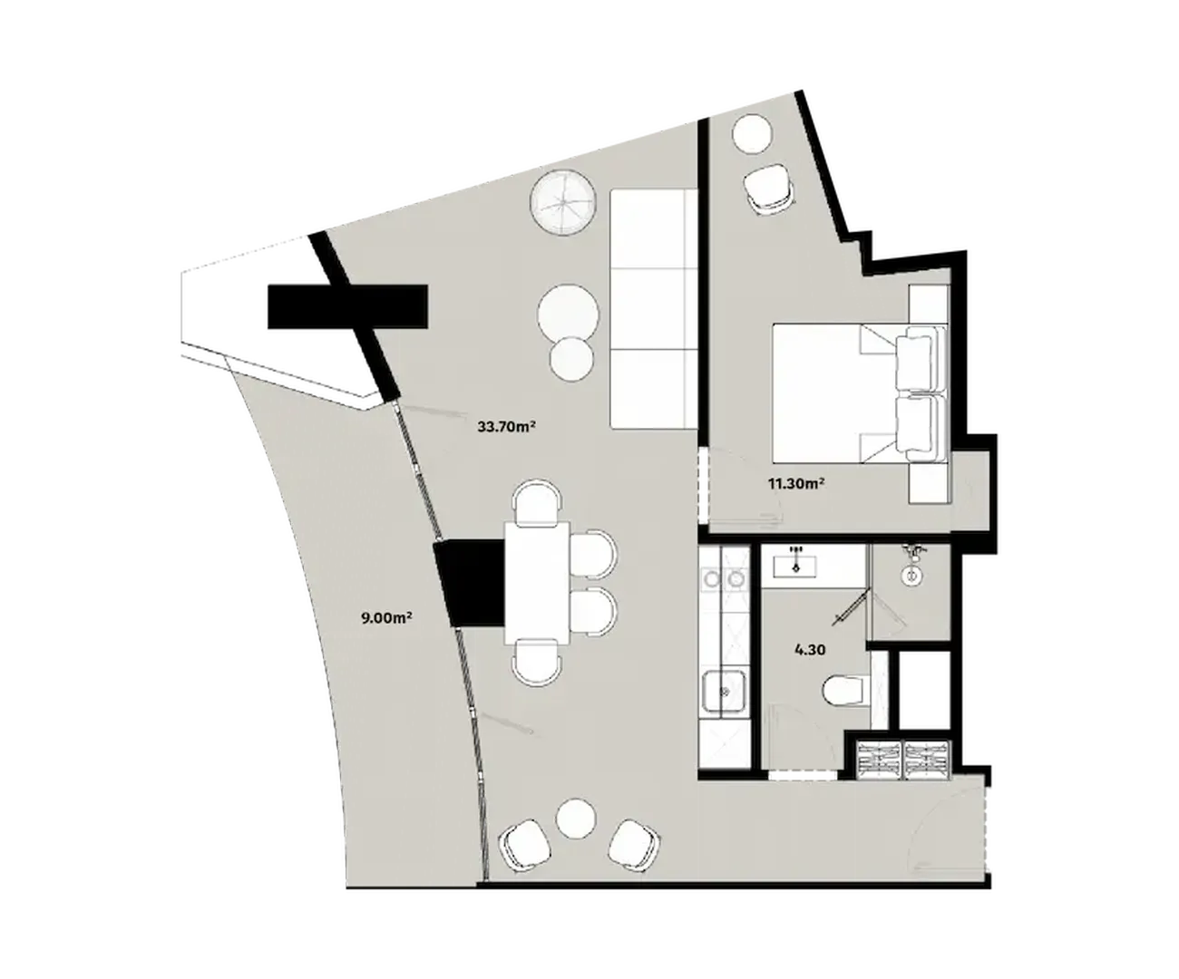 The flat includes isolated bedroom (11.30 m²), spacious studio living room (33.70 m²) и separate bathroom (4.30 m²). The feature is. spacious balcony (9.0 m²)The large windows fill the interior with light and the harmonious zoning creates a sense of freedom and privacy. Large windows fill the interior with light, and harmonious zoning creates a sense of freedom and privacy.