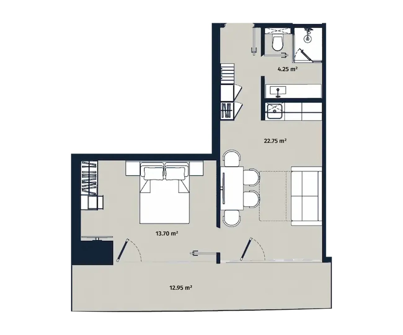 The flat includes isolated bedroom (13.70 m²), spacious living room (22.75 m²) и separate bathroom (4.25 m²). The feature is. spacious balcony (12.95 m²)The large windows fill the interior with light and the harmonious zoning creates a balance between privacy and openness. Large windows flood the interior with light, and harmonious zoning creates a balance between privacy and openness.