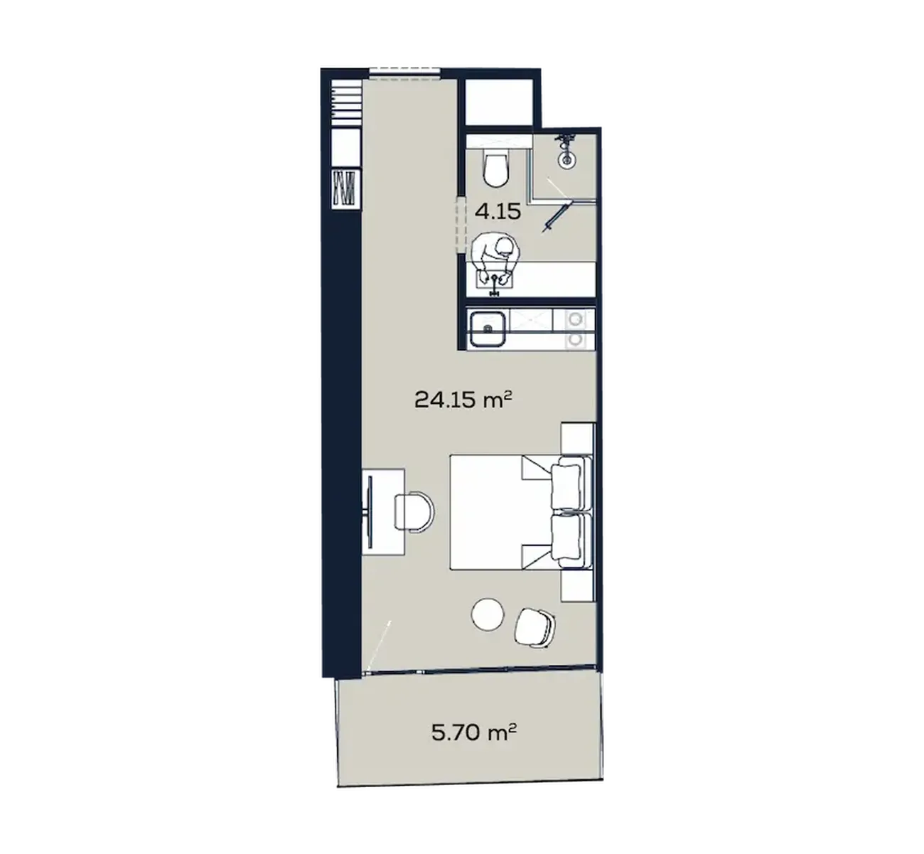Compact but functional space residential area (24.15 m²) with clever zoning combines living room and sleeping area. Complementing the flat separate bathroom (4.15 m²) и comfortable balcony (5.7 m²) for morning coffee or evening relaxation with a view of the city. Large windows flood the interior with light, creating a sense of lightness, and the modern layout allows every metre to be used to maximum effect.