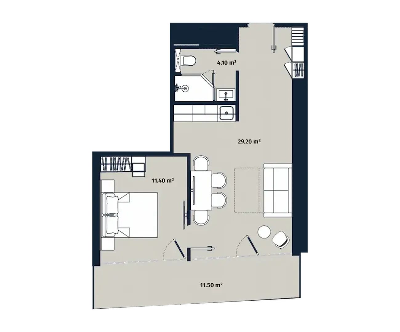 The flat includes isolated bedroom (11.40 m²), spacious living room (29.20 m²) и separate bathroom (4.10 m²). The feature is. spacious balcony (11.50 m²)which easily becomes an additional living room, a place to relax or work with a view of the city. Large windows fill the interior with light, and harmonious zoning creates a feeling of spaciousness and cosiness.