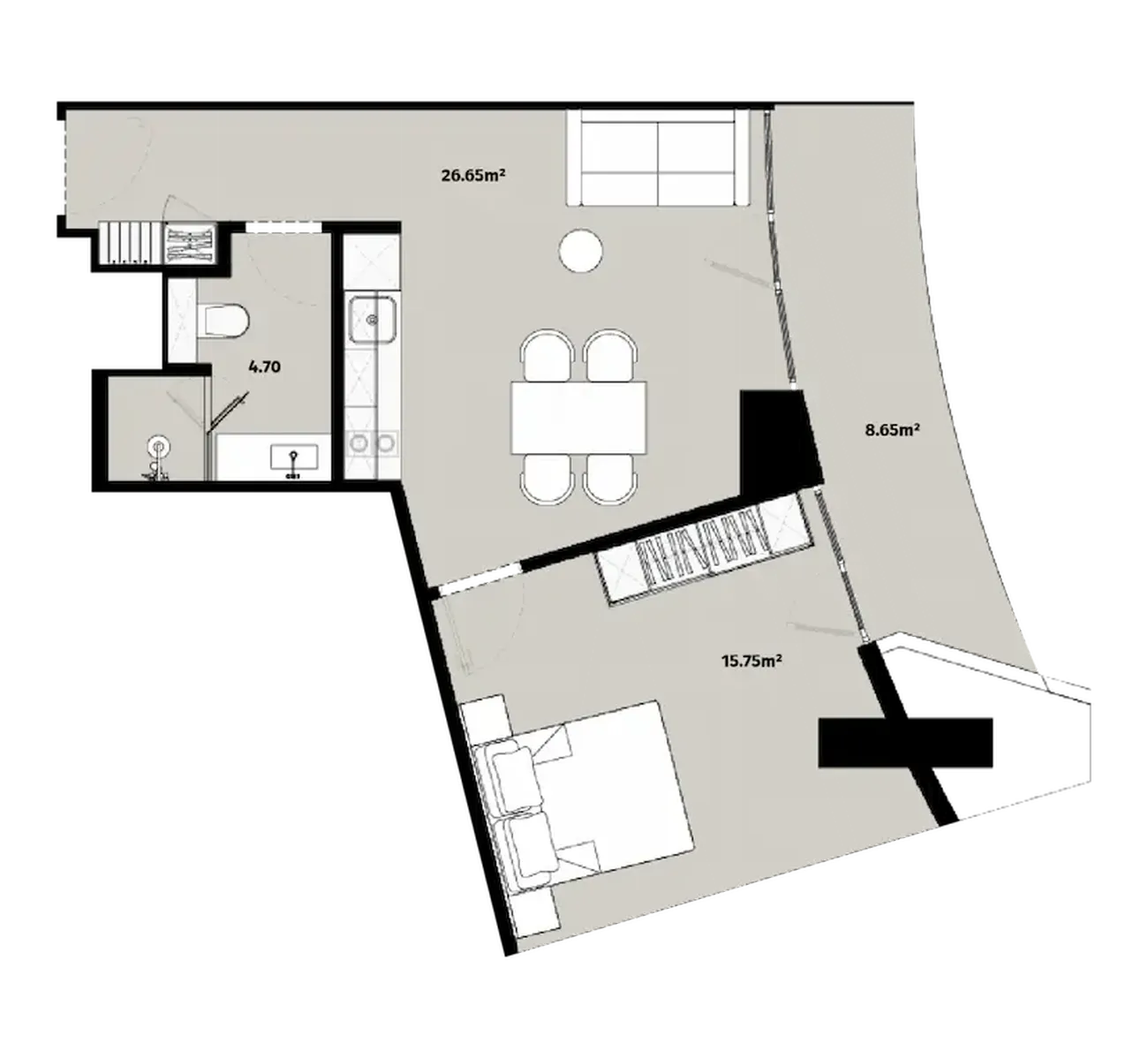 The flat includes isolated bedroom (15.75 m²), spacious living room (26.65 m²) и separate bathroom (4.70 m²). The feature is. comfortable balcony (8.65 m²)which becomes the ideal place for relaxation, breakfast or evening meetings with a view of the city. Large windows flood the interior with light, while harmonious zoning creates a sense of freedom and privacy.