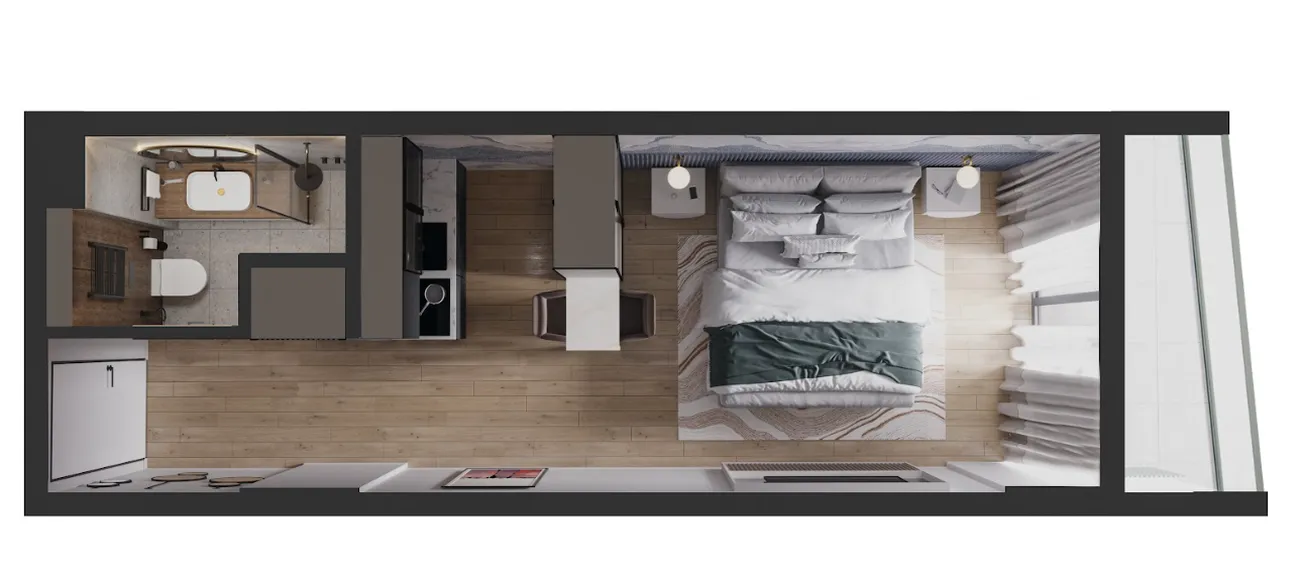 Living area (22.7 m²) with clever zoning combines the living room and sleeping area, creating an atmosphere of freedom and light. Complements the flat spacious balcony (9.6 m²) - a real advantage, transforming into a private observation deck with breathtaking views. Panoramic windows enhance the effect of being in a dynamic landscape, flooding the space with natural light.