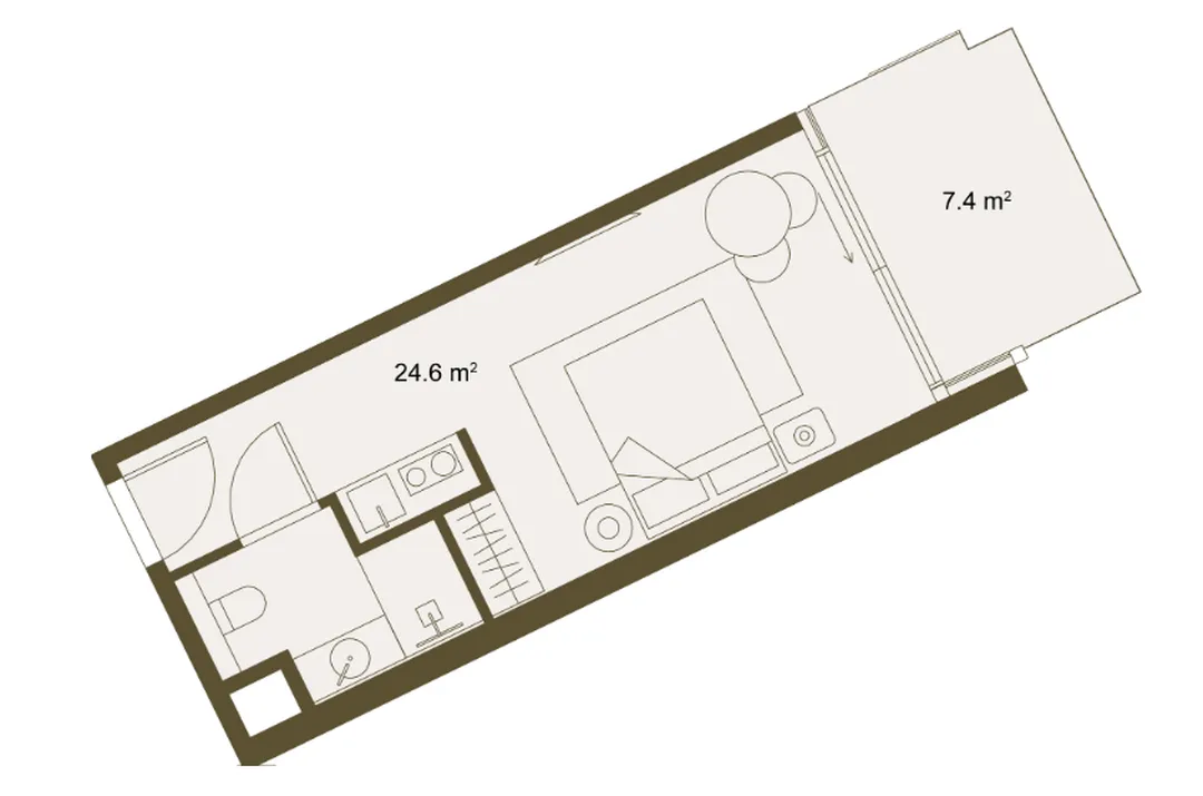 Functional core (21.6 m²): A concise, technically equipped transformer space. It has everything you need for sleeping, relaxing and a minimalist smart-living kitchen. It is your quiet haven for privacy and sleep.