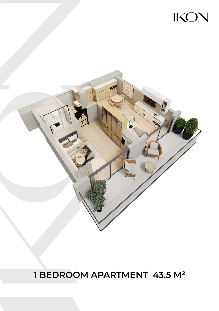 El espacio se organiza como una única zona luminosa en la que el salón, la cocina y la zona de dormitorio forman un conjunto armonioso. Una ventaja importante es balcón privadoque amplía visualmente el espacio y ofrece espacio adicional para relajarse. Acristalamiento panorámicoLa espaciosa distribución del piso, característica del proyecto IKON, llena el piso de luz natural, y la estudiada distribución permite disponer de una cómoda zona de vestidor. El cuarto de baño es independiente, lo que añade comodidad al día a día.