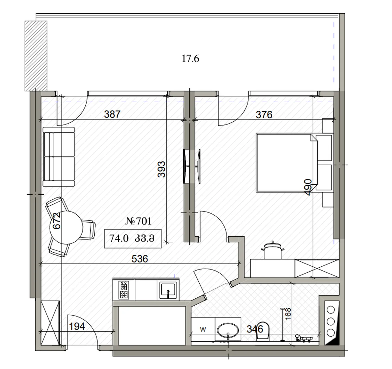 El piso ofrece una moderna distribución diáfana: una espaciosa combinación de salón, dormitorio y zona de cocina crea una sensación de libertad y luminosidad. El gran balcón se convierte en una extensión de pleno derecho del espacio vital: aquí puede organizar una zona de desayuno, relajación o un mini-jardín. Las ventanas panorámicas proporcionan abundante luz natural, y el acabado llave en mano de alta calidad permite utilizar la habitación inmediatamente.