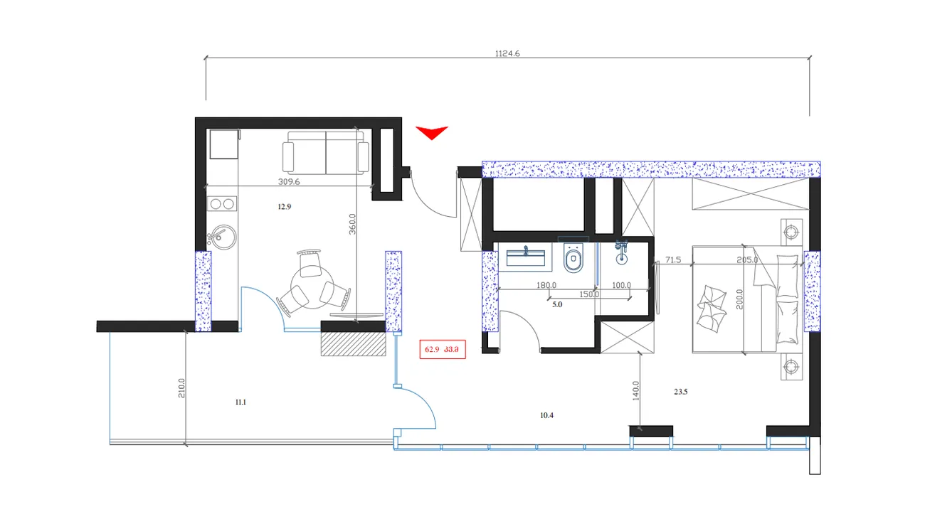 Amplio estudio en un prestigioso complejo Club Náutico ELT en el nuevo bulevar de Batumi. La superficie total es de 62.80 м²incluido el balcón. 11.1 м²sala de estar 12.9 м²la sala principal. 23.5 м² y un cuarto de baño independiente 5.0 м².