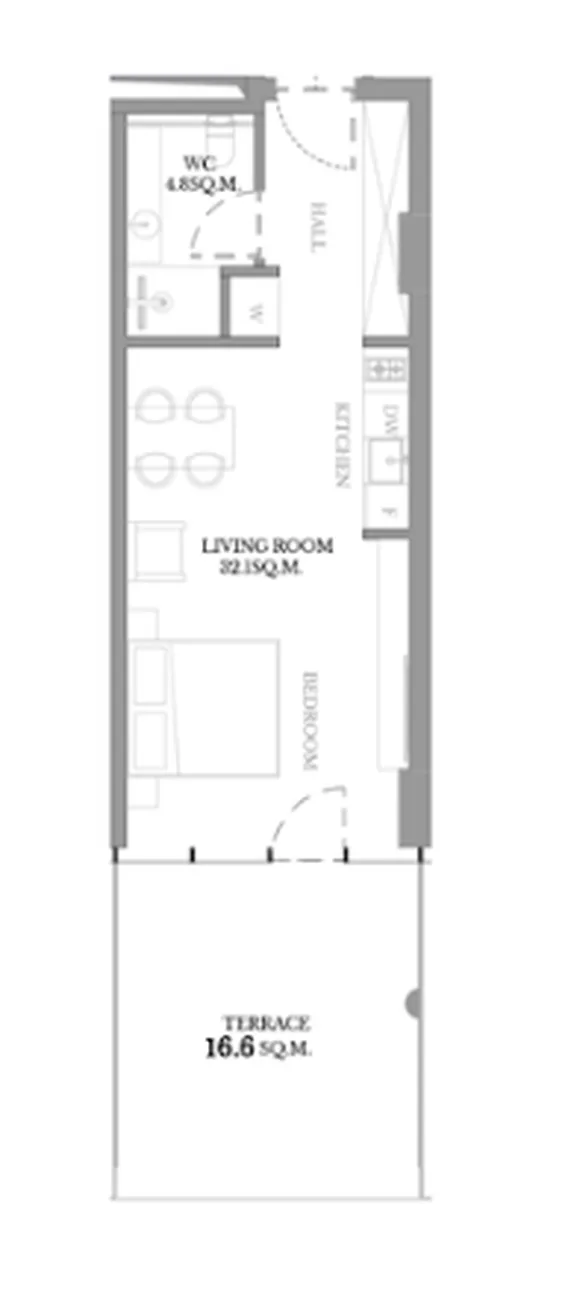 El amplio salón diáfano (32,15 m²) crea un espacio luminoso y aireado para vivir. El espacio extra (en comparación con los estudios estándar) le permite acomodar cómodamente todas las áreas necesarias. La terraza privada (16,6 m²) es su propia zona de estar al aire libre. El moderno cuarto de baño (4,85 m²) está listo para terminar. El equilibrio perfecto entre amplitud interior y espacio exterior privado.