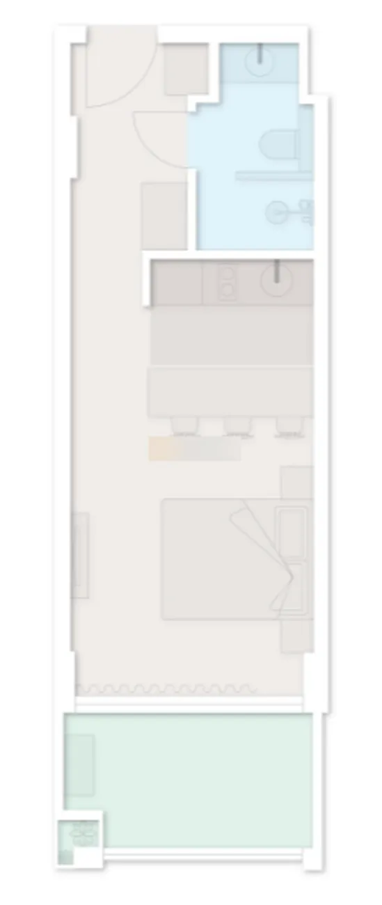 Un espacio diáfano sin tabiques innecesarios: el salón, la cocina compacta y la zona de dormitorio se combinan orgánicamente en un único volumen. Un gran ventanal llena el estudio de luz natural, y el balcón se convierte en un lugar acogedor para el café matutino con vistas a la vegetación o a la brisa marina. Gracias a su ubicación en un complejo con territorio cerrado e infraestructura desarrollada, el piso da sensación de comodidad y seguridad.