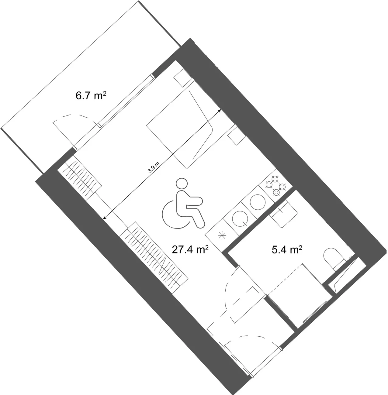 L'appartement offre une conception compacte et ergonomique. aménagement du studiooù la cuisine, le séjour et les chambres sont combinés pour créer une sensation d'espace. ✅ Balcon privé Il s'agit d'un complément agréable, qui prolonge l'espace de vie et offre un lieu de détente. L'agencement astucieux et la salle de bains complète (5,4 m²) répondent à toutes les exigences du confort moderne.