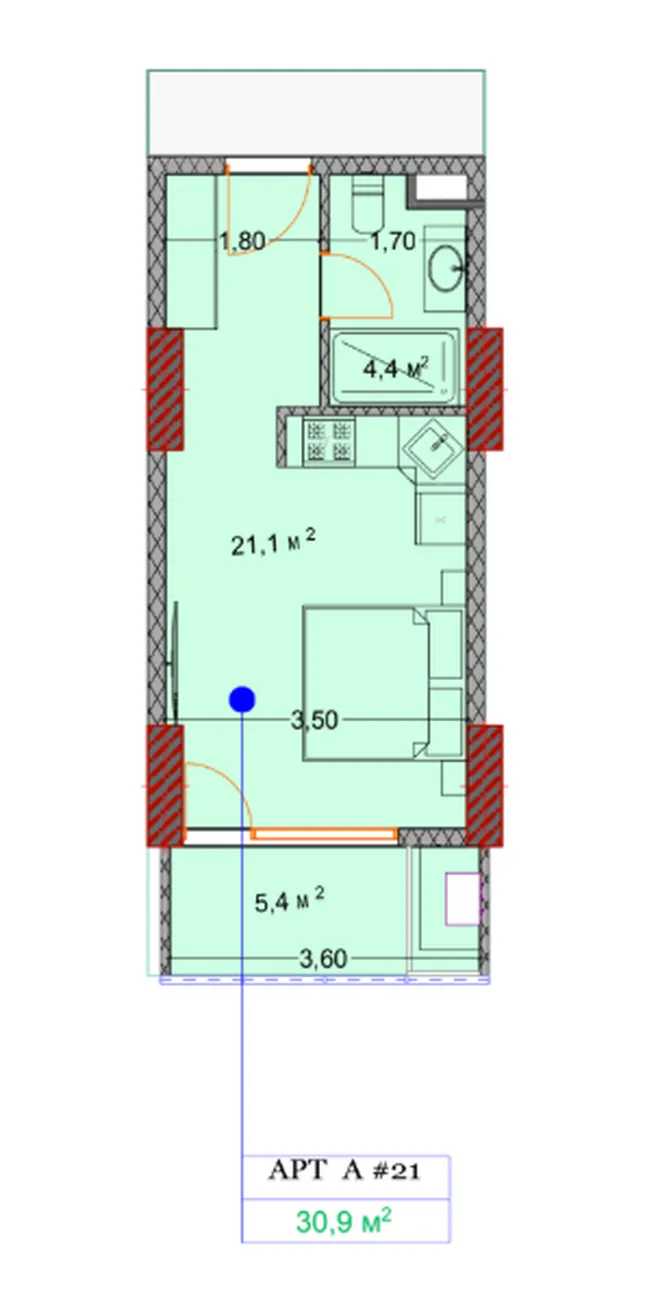 Salon spacieux 21,1 м² combinée avec la cuisine. Salle de bain moderne séparée 4,4 м²Entrée pratique et balcon lumineux 5,4 м²L'aménagement se caractérise par une utilisation réfléchie et efficace de chaque mètre, créant une sensation d'espace et de confort. L'aménagement se caractérise par une utilisation réfléchie et efficace de chaque mètre, créant une sensation d'espace et de confort.