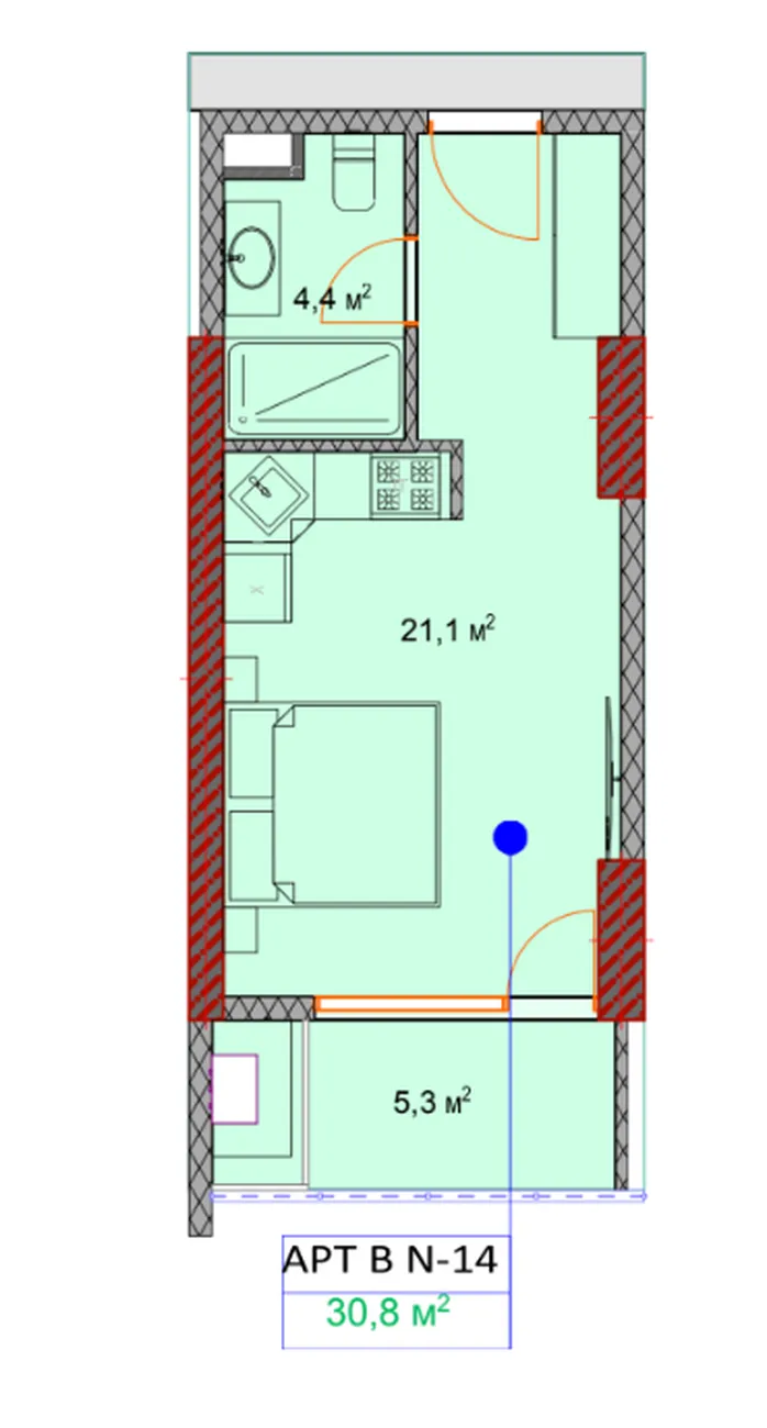 - Zone principale 21,1 м² combine le salon, la chambre et la cuisine, ce qui vous permet d'aménager l'espace en fonction de vos besoins.
