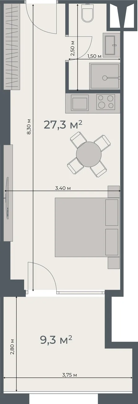 Carré : Total - 36.6 m² (Séjour : 27.3 m², Terrasse : 9.3 m²)