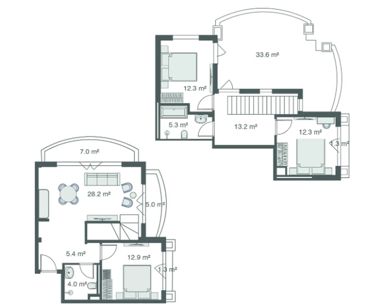 Le premier niveau comprend un spacieux salon-cuisine (28,8 m²), une chambre isolée (12,9 m²), une salle de bains et l'accès à trois terrasses. L'étage supérieur est un espace privé avec deux chambres identiques (12,3 m² chacune), une salle de bains et l'accès à deux terrasses, dont l'une est immense (33,6 m²) et peut devenir votre jardin privé ou un espace de détente. Avantages : aménagement idéal pour une grande famille ou des invités, chambres isolées à différents étages, vitrage panoramique et terrasses extérieures record.