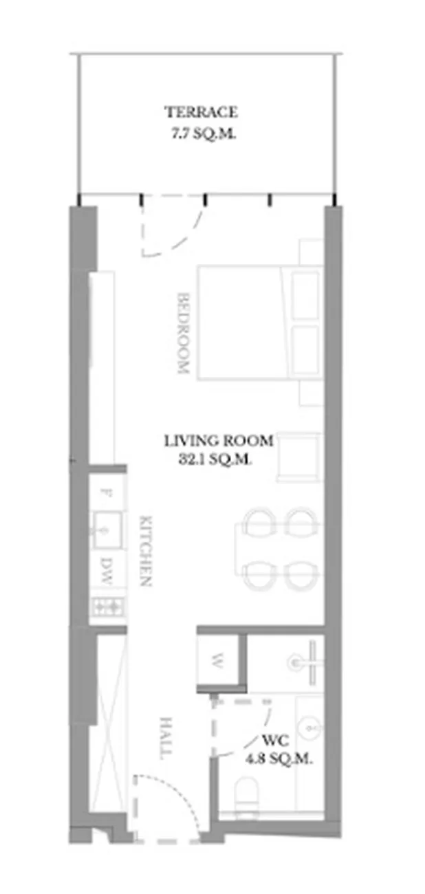 L'espace de vie ouvert exceptionnellement grand (32,10 m²) crée un espace lumineux et ouvert pour se détendre, dormir et cuisiner. Le balcon séparé (7,7 m²) est votre coin privé pour le café du matin ou la détente du soir au grand air. La salle de bains moderne (4,8 m²) est prête à être finalisée. L'avantage principal est la combinaison rare de l'espace intérieur et de l'intimité à l'extérieur, entouré par la forêt.