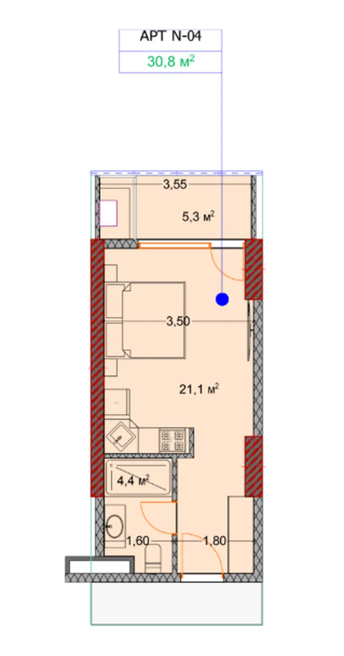 Il s'agit d'un studio moderne et confortable. Sa superficie totale est de environ 31,3 m²y compris un balcon spacieux 5,3 м². La propriété est située dans un complexe résidentiel en construction dans l'un des quartiers modernes de Batumi.