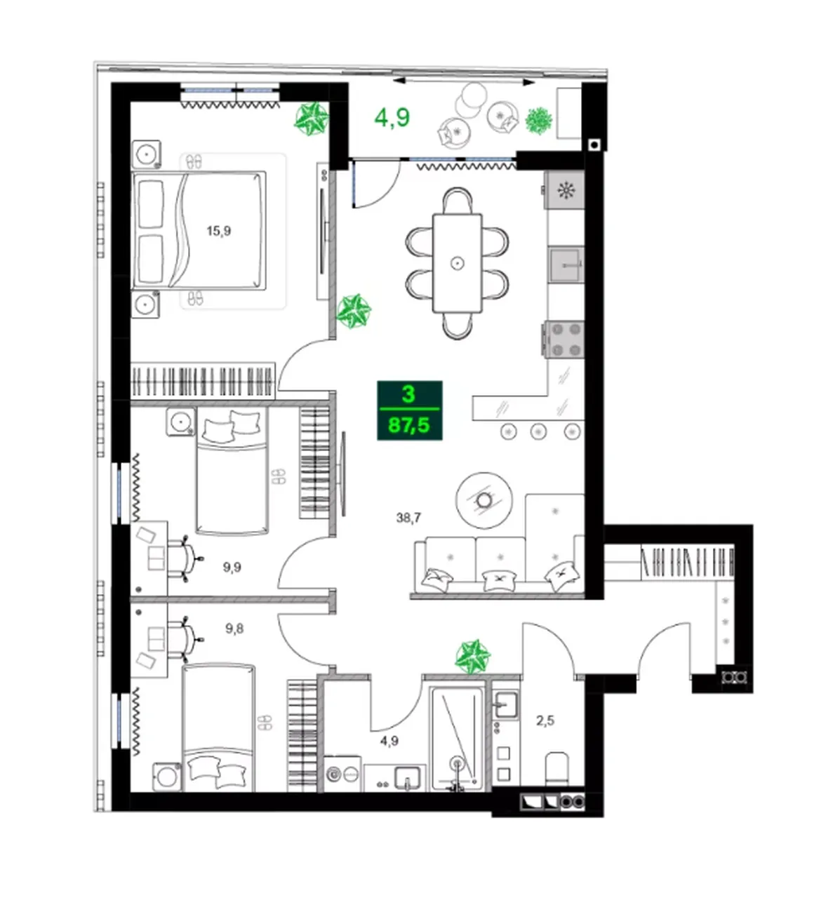 Trois chambres isolées (15,9 m², 9,9 m², 9,8 m²) offrent une intimité totale à tous les membres de la famille ou aux invités. La pièce maîtresse est le lumineux salon-salle à manger 38.7 м²L'appartement peut facilement accueillir une grande entreprise. Salle de bain séparée (salle de bain et toilettes) et balcon 4.9 м² compléter l'image du confort. ✅ Points forts : Un format de villégiature rare avec trois chambres, un vaste espace commun, un zonage clair et beaucoup de lumière naturelle.