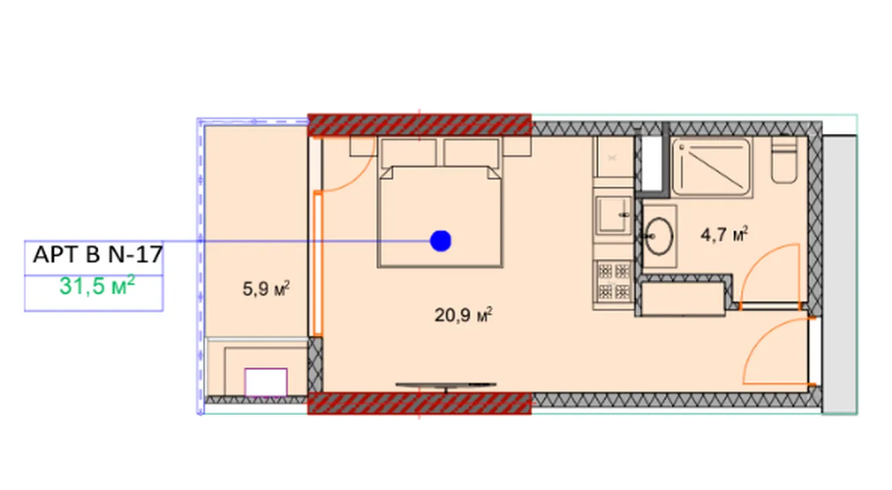 - Zone principale 20,9 м² combine le salon, la chambre à coucher et la cuisine-salle à manger, ce qui vous permet d'expérimenter avec le design.