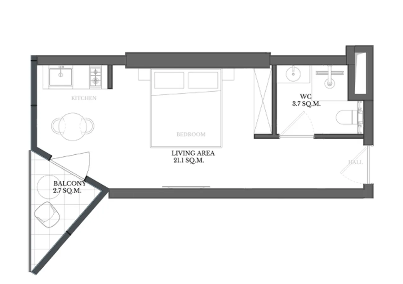 חלל פתוח ותמציתי מאחד את הסלון ואת אזור המטבח (21.1 מ"ר). חדר הרחצה משולב. למרות גודלה הקומפקטי, הדירה כוללת את כל הדרוש לשהייה נוחה, ו מרפסת מוסיף אפשרות נעימה לבילוי באוויר הצח. ✅ יתרונות: שטח יעיל ביותר, תכנון מודרני, חלל מואר ומוכנות לאכלוס מהיר.