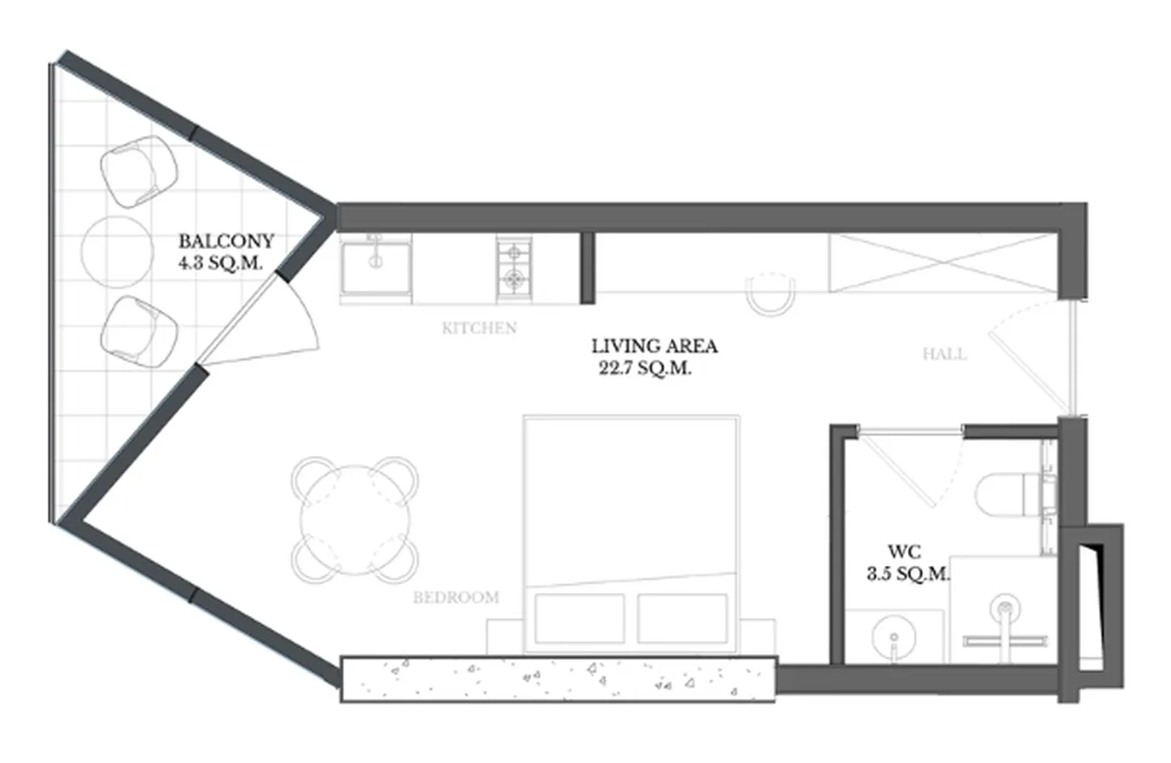 חלל פתוח ופרקטי מאחד את הסלון ואת אזור המטבח (22.7 מ"ר). חדר הרחצה משולב. הדירה מתאפיינת בתכנון מחושב, שבו כל מטר מנוצל ביעילות. מרפסת 4.3 מ"ר מהווה תוספת נעימה לקפה של הבוקר או למנוחה בערב. ✅ יתרונות: פתרון מוכן לכניסה, עיצוב לקוני, שטח אופטימלי לשירות.