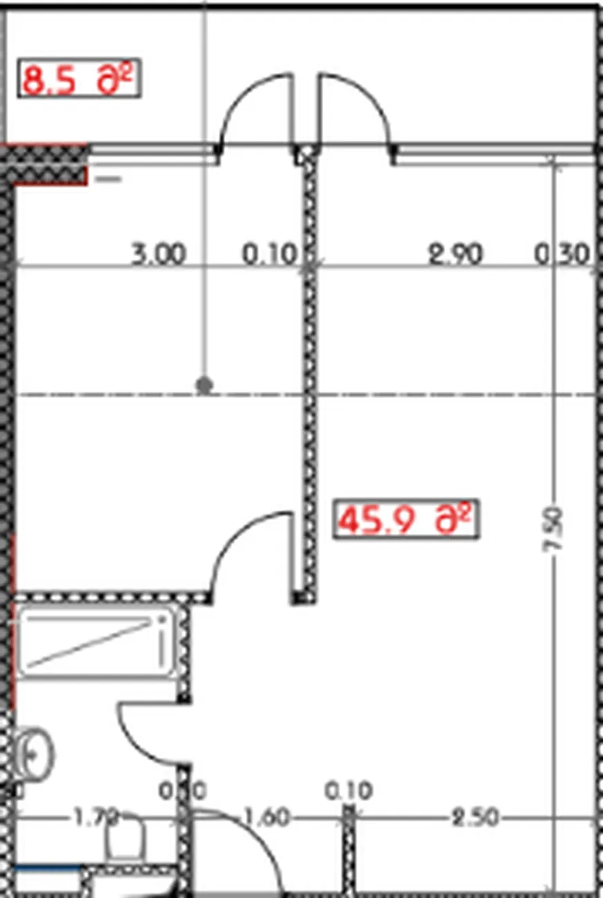 Appartamento con una camera da letto - Superficie totale: 54,4 m² - Superficie abitabile: 45,9 m² - Balcone: 8,5 m² - Complesso residenziale "Calligraphy Towers - Quartiere di Alley of Heroes, Batumi.