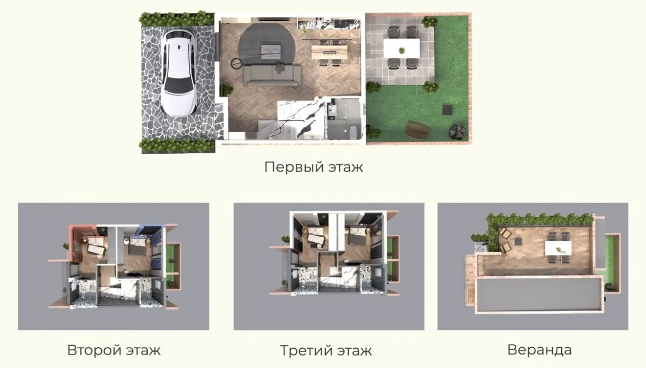 *️⃣ Famiglie con bambini - Quattro camere da letto isolate offrono a ogni membro della famiglia uno spazio privato, mentre l'ampio soggiorno e la terrazza diventano un luogo dove trascorrere il tempo libero insieme. Gli asili e le scuole sono vicini e l'aria pulita e l'atmosfera tranquilla di Chakvi sono ideali per la crescita dei bambini.